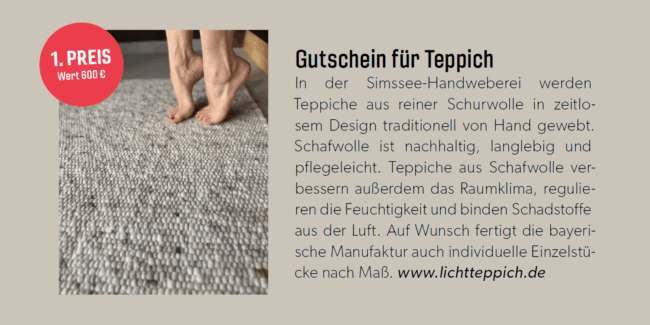 In der aktuellen Ausgabe der Bio-Zeitschrift „Schrot & Korn“ wartet mit ein bisschen Glück ein kuscheliger Hauptgewinn auf Sie: Ein Gutschein für deinen neuen Lieblings-Teppich im Wert von 600 €!…